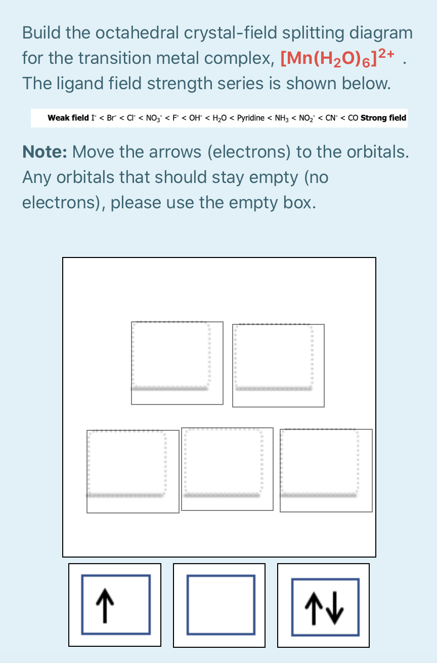 Solved Construct The Octahedral Crystal Field Splitting Diagram For The Metal In Each Species You Are Currently In A Labeling Module Turn Off Browse Mode Or Quick Nav Tab To Items Space Or Enter