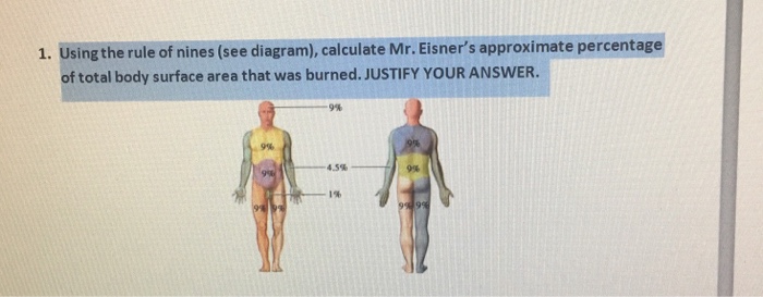 Aug 28, 2020 · When measuring burns in adults, the rule of nines assesses the percentage of burn and is used to help guide treatment decisions including fluid resuscitation and becomes part of the guidelines to determine transfer to a burn unit. You can estimate the body surface area on an adult that has been burned by using multiples of 9. In an adult who has been burned, the percent of the body involved can be calculated as follows: