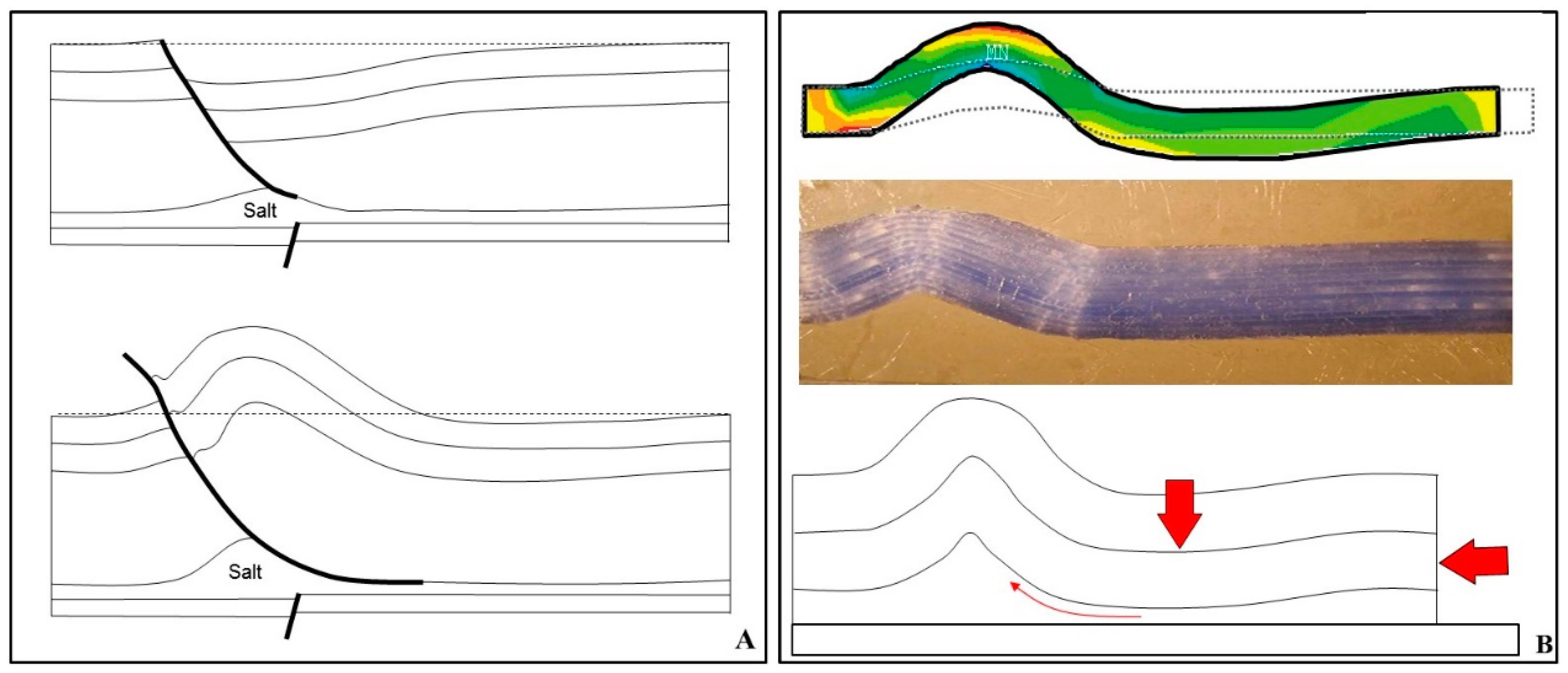 The block diagram below shows several different structures. Match the correct structure with its name. Structure 3 is a salt dome. Some of the folds are plunging. Structure 1 [ Choose ]:syncline, reverse fault, anticline, normal fault. Structure 2 [ Choose ]:syncline, reverse fault, anticline, normal fault