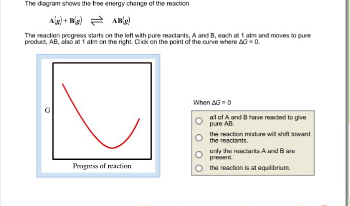 11 Dec 2019 — Get the detailed answer: The diagram shows the free energy change of the reaction: The reaction progress starts on the left with pure ... The Gibbs free energy change (ΔG) and how it's related to reaction spontaneity and equilibrium.