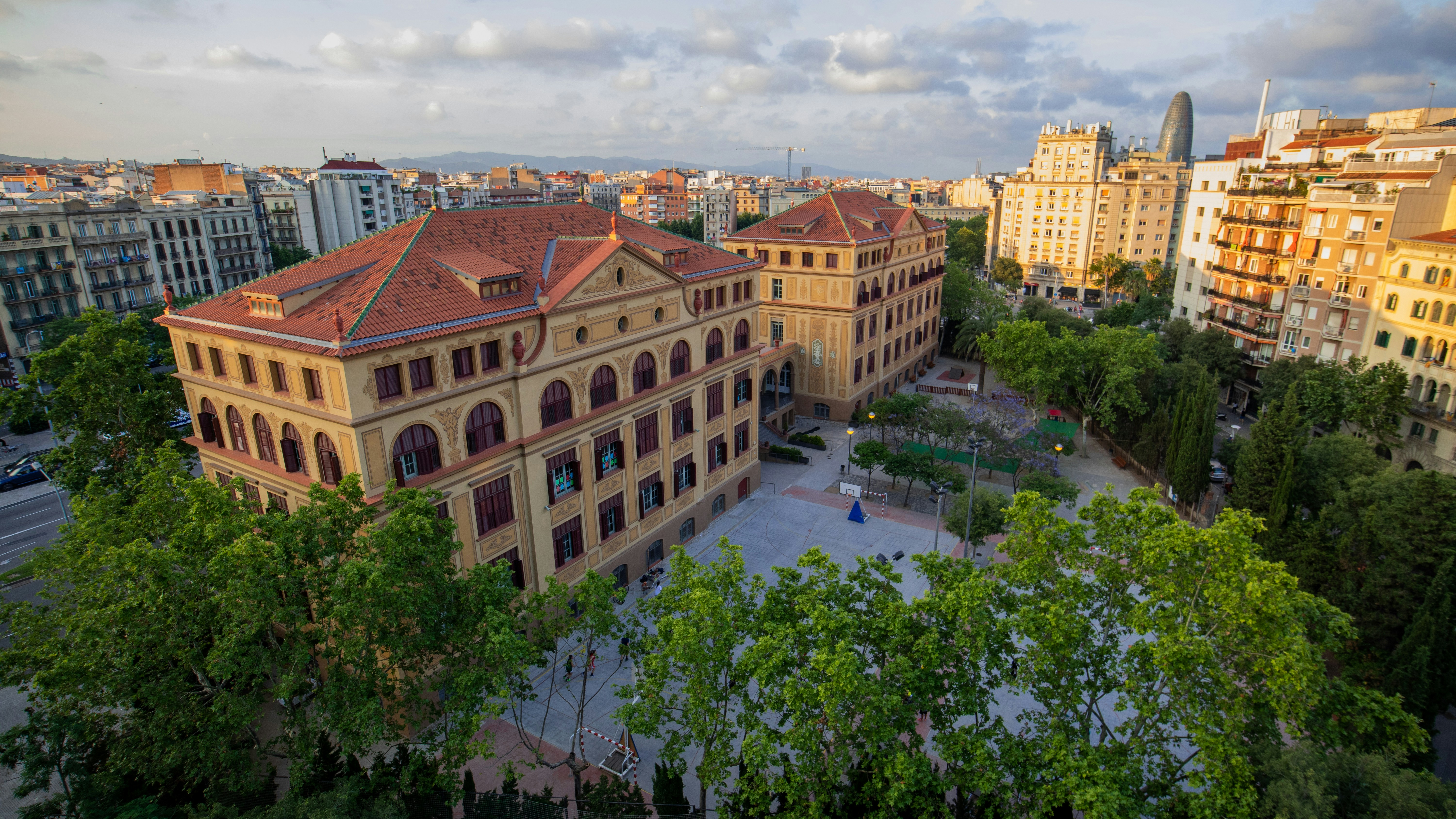 A beautiful park next to La Sagrada Familia, with Agbar Tower in the distance.