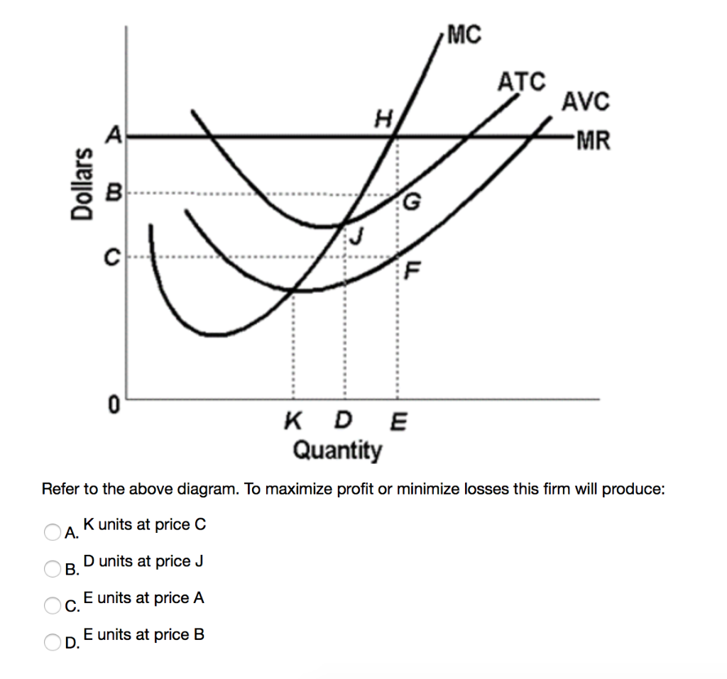 Refer to the above diagram. To maximize profits or minimize losses this firm should produce: E units and charge price A. Rating: 5 · 6 reviews