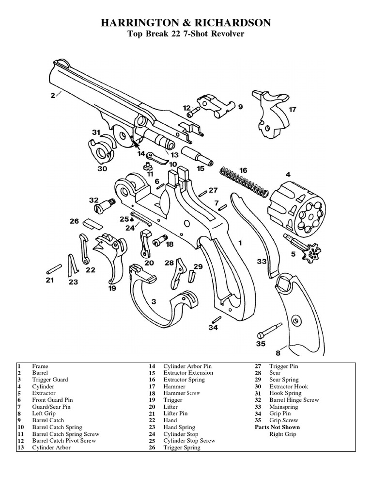 HARRINGTON & RICHARDSON Topper Model 88 Parts: Trigger, Guard, Hammer, Pins, H&R - $54.88. FOR SALE! Harrington & Richardson Topper Model 88 Parts: (from a ... H&r Top Break Revolver Diagram. H&R , LLC (Harrington & Richardson) is a manufacturer of firearms under the Harrington .. H&R 'Handy-Gun' (single-shot top-break pistol, bore, 28 gauge, 8-inch or 12 1⁄4-inch barrel) manufactured ; H&R Came with 4 choke tubes: IC, M, IM and F. Discontinued due to lack of parts availability. Shop from the world ... We sell many hard to find obsolete gun parts for rifle shotgun pistol revolver gunsmith repair. History of Harrington & Richardson. The year was 1871. The N.R.A. was formally organized, Iver Johnson began operations and Franklin Wesson, with his nephew Gilbert Henderson Harrington, formed a partnership to develop a new shell-ejecting revolver that had been invented by Harrington. Both men had a background in the firearms business.