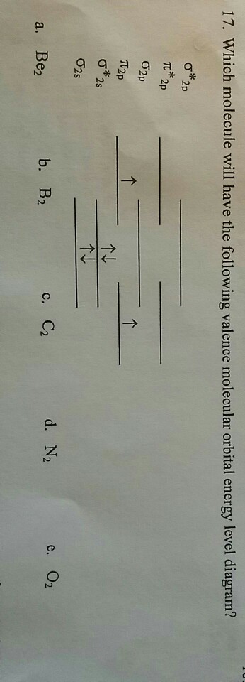 Complete this valence molecular-orbital diagram for oxygen o2. August 11, 2020 - The bond length in the oxygen species can be explained by the positions of the electrons in molecular orbital theory. To obtain the molecular orbital energy-level diagram for \(\ce{O2}\), we need to place 12 valence electrons (6 from each O atom) in the energy-level diagram shown in Figure ... FREE Answer to Complete this valence molecular-orbital diagram for oxygen, O2. Click the blue boxes to add electrons as... September 15, 2016 - The electron configuration for oxygen is: 1s^2 2s^2 2p^4 This video will walk you through the step of writing orbital diagram. The video uses Kr as an example, but the process is exactly as the same as what you need to do for oxygen. Hope this helps! Eight possible homonuclear diatomic ... C2, N2, O2, F2, and Ne2. However, we can predict that the Be2 molecule and the Ne2 molecule would not be stable. We can see this by a consideration of the molecular electron configurations (Table 3). We predict valence molecular orbital electron ...
