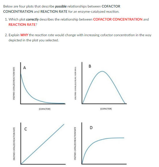 Which term best describes the relationship between L-alanine and D-alanine? ... Which of the following correctly matches the amino acid with its three-letter abbreviation? ... The diagram below shows the energy pathway of an uncatalyzed reaction. How does the energy diagram change when an enzyme is used in the same reaction? Which of the following statements correctly describe the relationship between reaction rate and concentrations of reactants and products? Select all that apply. Reactants (or products) with large coefficients have relatively high rates of disappearance (or appearance).