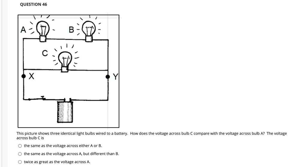 Light bulbs are not a one-size-fits-all affair. From wattage to bases and the overall shape and size of the glass or plastic bulb, it’s important to know specifically what you need. Whether you’re dealing with incandescent or LED light bulb... Transcribed Image Text. Three identical light bulbs are connected to a battery as shown in the diagram below. Which adjustment/s could be made to the circuit that would increase the В Increase the voltage of the battery because it will increase the current as long as the resistance is held constant. Problem 44 Easy Difficulty. Three identical light bulbs are connected to two batteries as shown in Figure 18.106 (a) To start the analysis of this circuit you must write energy conservation (loop) equations. Each equation must involve a round-trip path that begins and ends at the same location.