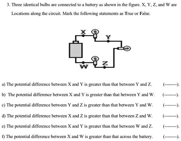 TRUE or FALSE: Three light bulbs are connected in series. The filament of one of the light bulbs burns out. The remaining two light bulbs will still be 10. Three identical light bulbs are connected to a battery as shown below. Which adjustments could be made to the circuit that would increase the...