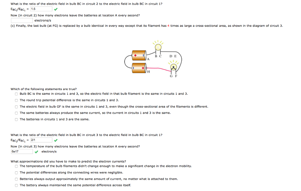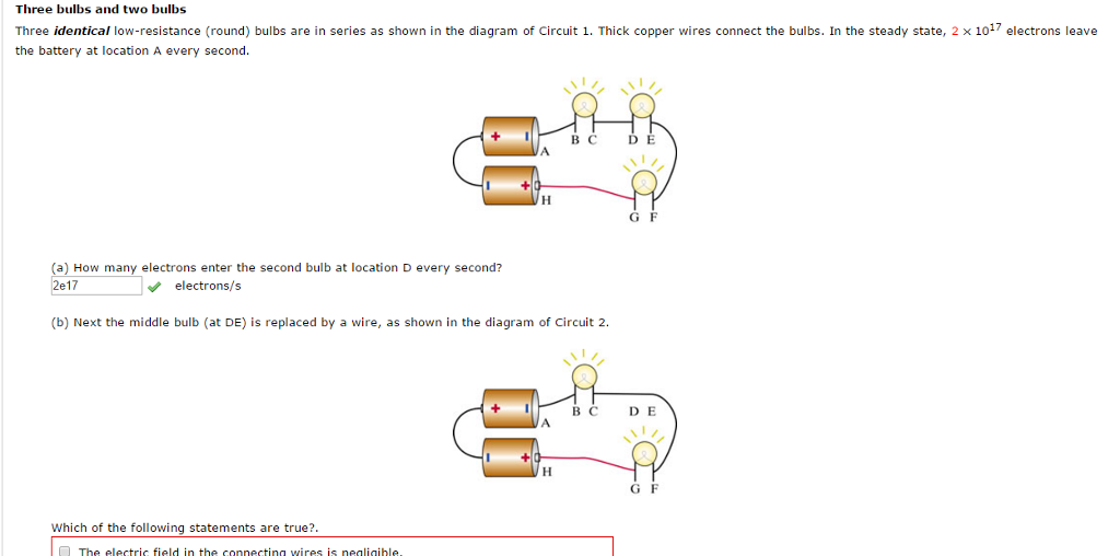 electric field inside bulb. Three identical light bulbs are connected to two batteries asshown in the diagram above.Each battery has an emf of 1.4volts. The length of the tungsten filament in each bulb is0.008 m. The radius of the filament is5e-6 m (it is very thin!).