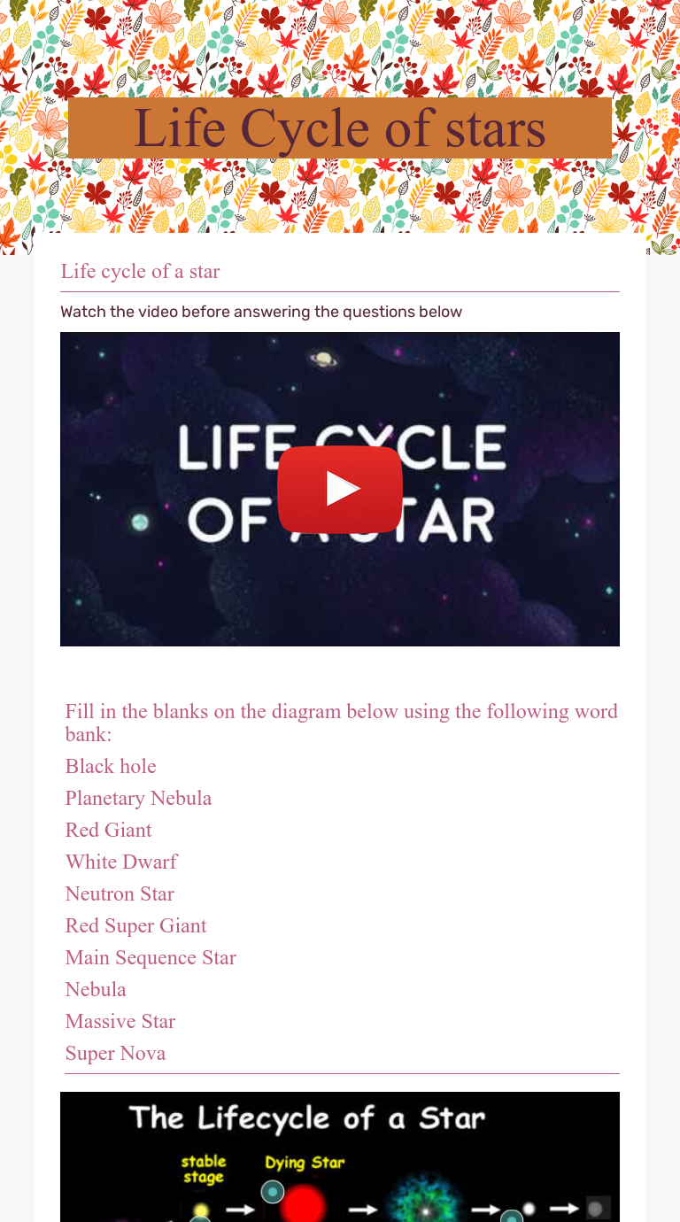 Life cycle of a star diagram worksheet. Browse Printable Science Worksheets | Education.com Browse Printable Science Worksheets. Award winning educational materials designed to help kids succeed. Learn about the life cycle of an amphibian with this diagram of the life of a frog! Share a star-gazing session with your little astronomer! This constellation chart is full of fun stories about the... Lifecycle of a star - diagram worksheet Life Cycle of a Star Diagram by Kiana Brambleby - Prezi. Just Now Lasts about 10 billion years. Starts as a Prostar. Activity: Life Cycle of a Massive Star - NASA. 2 hours ago The main sequence star may live millions or even billions of years. Step 4 - Red - The star expands into a red giant when the... Solar System Worksheets - Great Printables for Kids! - Fun with Mama These solar system worksheets are great for a wide variety of ages. These learning printables are full of information and include over 50 pages! Blast off into space with these amazing space printables. Kids will have a great time working on their literacy, numeracy and handwriting skills with these Solar... The life cycle of stars - The life cycle of stars - Edexcel - GCSE... The life cycle for a particular star depends on its size. The diagram shows the life cycles of stars that are The fusion process releases energy, which keeps the core of the star hot. Main sequence star. During this stable phase in the life of a star, the force of gravity holding the star together is balanced...