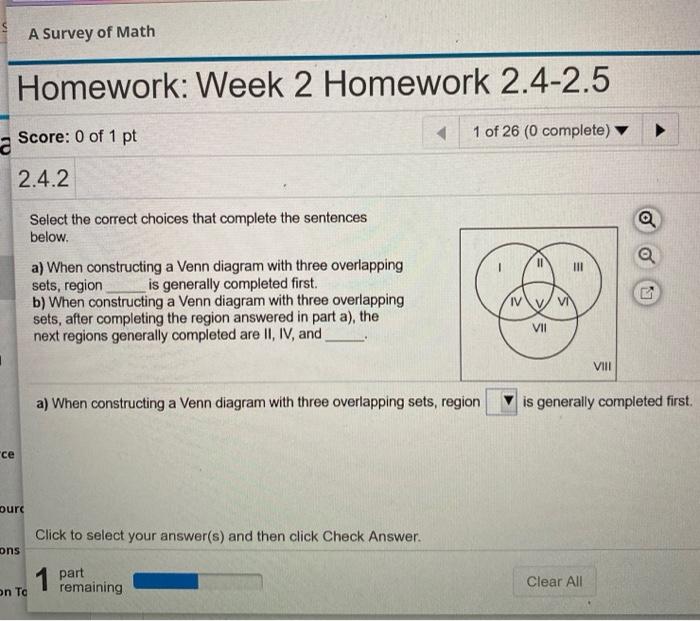 Solved A Survey of Math Homework: Week 2 Homework 2.4-2.5 ... b) when constructing a venn diagram with three overlapping sets, after completing the region answered in part a), the next regions generally completed are ii, iv, and iv 9 vii viii a) when constructing a venn diagram with three overlapping sets, region is generally completed first. се durc click to select your answer (s) and then click check … 2.4.Venn Diagrams with Three Sets - 2 - Venn Diagrams with ... 1st assignment venn diagrams with three sets the number of regions created when constructing venn diagram with three overlapping sets is olympic medals consider Section 2.4 Homeework.pdf - Student Ishwor Shrestha Date ... Fill in the blank with an appropriate word, phrase, or symbol (s). The number of regions created when constructing a Venn diagram with three overlapping sets is _______. The number of regions created when constructing a Venn diagram with three overlapping sets is 8. Complete DeMorgan's laws. Solved - 1. The number of regions created when Answer ... 1. The number of regions created when constructing a Venn diagram with three overlapping sets is_____. 2. (a) When constructing a Venn diagram with three overlapping sets, region_____ is generally completed first.