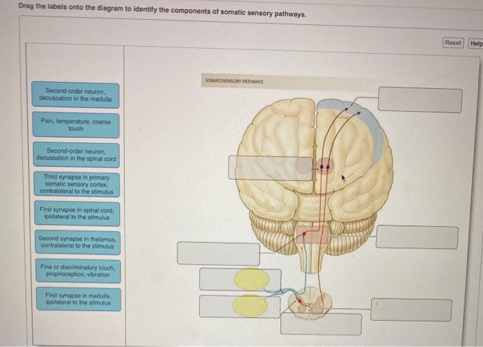 Solved Drag the labels onto the diagram to identify the ... Experts are tested by Chegg as specialists in their subject area. We review their content and use your feedback to keep the quality high. Transcribed image text: Drag the labels onto the diagram to identify the components of somatic sensory pathways.