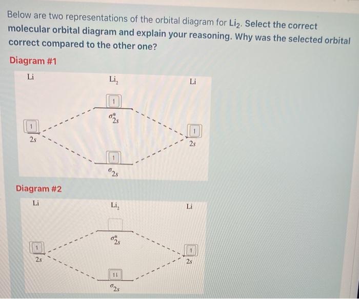 Solved Fill in the Molecular Orbital Energy Diagram for ... Solved Fill in the Molecular Orbital Energy Diagram for the | Chegg.com. Science. Chemistry. Chemistry questions and answers. Fill in the Molecular Orbital Energy Diagram for the diatomic molecule Li2. lithiuma MO's lithiums o* 2 2s - 2s 625 Ε o*ls ls ls G1s. Li2 Mo Diagram - schematron.org Molecular orbital (MO) theory describes the behavior of electrons in a be in a bonding orbital, we would predict the Li2 molecule to be stable. Molecular orbital diagram of Li2 & Be2: Number of electrons in Li2 molecule =6. Li2 = σ1s2,σ*1s2,σ2s2. Nb=4, Na=2. B.O = (Nb- Na). B.O = ().